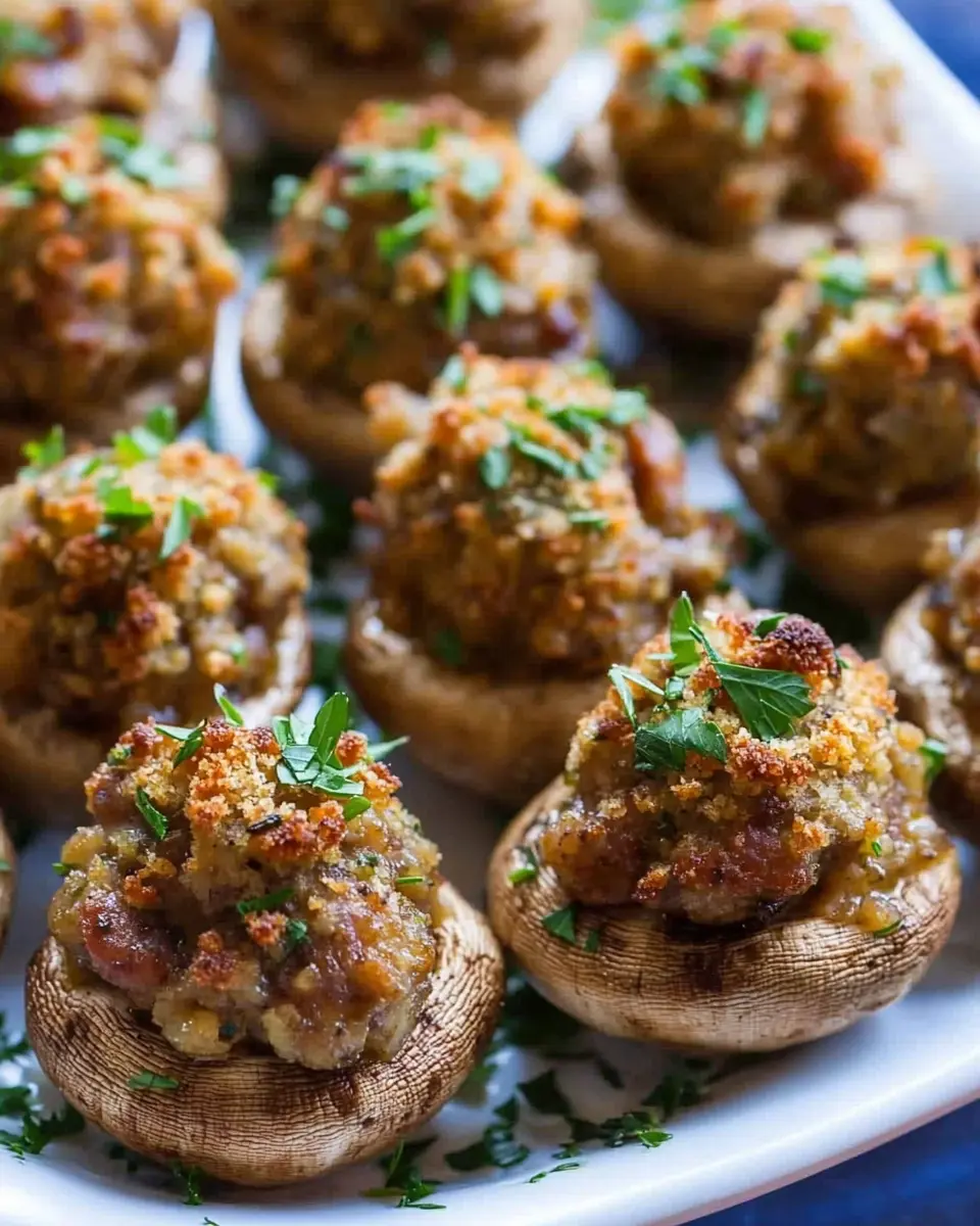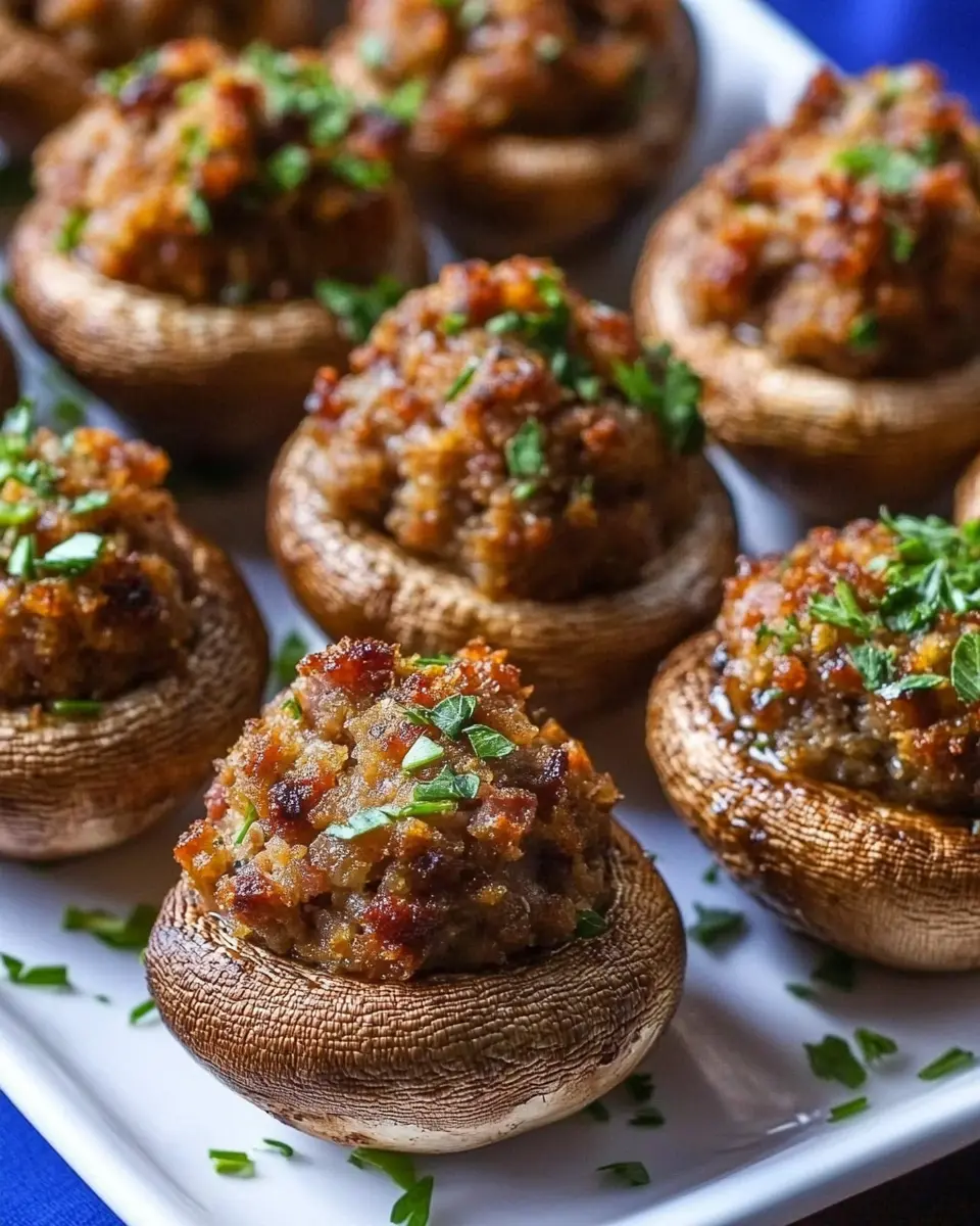 Delicious stuffed mushrooms filled with savory sausage and spices, perfect for appetizers or party treats.